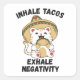 Joli design qui montre un chaton caricaturiste adorable portant un casquette sombrero et mangeant un taco mexicain avec la citation amusante "tacos inhale, exhale négativité. Une cuisine savoureuse vous rend heureux.