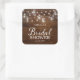 Autocollant rustique carré de Fête des mariées avec lumières dans des bocaux de maçon et cordes de lumières avec le mot "Fête des mariées" contre un arrière - plan motif de bois brun. C'est l'autocollant parfait pour une douche de nuptiale rustique ou country. Consultez l'invitation correspondante et les articles comme les autocollants et les timbres ici https://www.zazzle.com/collections/rustic_wood_mason_jars_and_lights-119202204970019494?rf=238364477188679314 Personnalisez-le en remplaçant le texte de l'espace réservé pour ajouter vos informations. Pour plus d'options, cliquez sur le bouton "Personnaliser". *Veuillez noter que le filigrane Zazzle qui apparaît dans l'aperçu du zoom n'apparaîtra PAS sur le produit imprimé final. © Bois de rose et agrumes