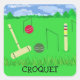 Un design amusant avec une pelouse verte herbacée, des cerceaux, des boules de croquet, un maillot et une cheville.