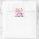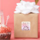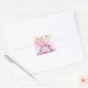 Chat rose mignon aux fleurs violettes merci autocollant pour la fête d'anniversaire de la petite fille.