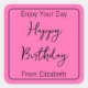 Cet autocollant rose chaud comporte trois champs de texte. Vous pouvez personnaliser le texte au besoin. En haut, on peut lire "Profitez de votre journée". Le texte du milieu dit "Joyeux anniversaire" en noir. Le texte du bas correspond au nom de l'expéditeur ou à un message personnalisé. (Montré : De Elizabeth)