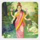Lakshmi est représenté dans l'art indien comme une femme élégamment habillée, aux couleurs dorées et prospères, debout ou assise sur un trône de lotus en padmasana, tout en tenant un lotus à la main, symbolisant la fortune, la connaissance de soi et la libération spirituelle. Son iconographie la montre à quatre mains, qui représentent les quatre aspects de la vie humaine importants pour la culture hindoue : le dharma, le kāma, l'artha et le moksha.