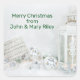 Bougie lanterne et ornements argentés dans la neige avec musique Silent Night. Le texte est modifiable.