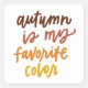 Ce design comporte l'expression "l'automne est ma couleur préférée", présentée dans un script design écrit à la main. Le texte est organisé en un alignement centré et empilé avec chaque mot occupant sa propre ligne, créant un flux visuellement agréable de haut en bas. La palette de couleurs est un dégradé de teintes d'automne chaudes, passant du marron foncé en haut pour le mot "automne" à un orange rouille plus clair pour "is my", et enfin à un jaune vif pour "favorite color". Cette transition de couleur reflète non seulement le riche spectre du feuillage d'automne, mais renforce aussi le sentiment exprimé dans l'expression.