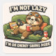 A funny illustration of a sloth lounging on a couch with snacks and a remote. The text above reads "I'M NOT LAZY" and below, "I'M ON ENERGY SAVING MODE." The sloth is surrounded by chips, a drink, and a video game controller, capturing the ultimate lazy day vibes with humor.