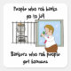 "Les gens qui volent les banques vont en prison. Les banquiers qui volent les gens reçoivent des primes." C'est ce qu'on dit ici, car de plus en plus de gens en ont marre des plans de sauvetage et du comportement avide des entreprises en général. Graphic montre un voleur de banque derrière les barreaux à côté d'une chemise blanche et un banquier de cravate léchant une grosse liasse d'argent.