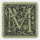 Lettre décorative de charme M monogramme initial style de calligraphie typographie première lettre en noir sur sauge vintage vert - avocat écaille de livre vert avec des feuilles blancs Ginkgo biloba.