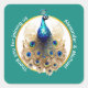 Un beau paon royal en 5D (5 dimensions) avec des plumes de poitrine bleu foncé chatoyantes et des plumes de queue bleu et or faux a sa couronne et vous regarde de côté. Cet oiseau élégant est dressé contre un cercle blanc rond bordé d'une fausse bordure dorée et verte turquoise sur laquelle des modèles blancs pour votre libellé personnalisé apparaît. L'oiseau semble sortir de l'autocollant adhésif / étiquette et est idéal pour les cadeaux de faveur de mariage; douches nuptiales merci de vous; anniversaires mariages et tout événement ou fonction qui a un thème paon.