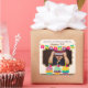 Célébrez l’anniversaire de votre adorable enfant de trois ans avec ce design coloré : trois petits gâteaux délicieux avec des bougies et des cerises, un bouquet d’anniversaire aux couleurs vives et un cadre photo assorti pour le dernier portrait de votre enfant, sur un arrière - plan à pois mignon. Remplacez l'exemple de photo et de texte par le vôtre pour un cadeau personnalisé.