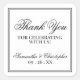 Ces autocollants de remerciement mariages sont simples, classiques, intemporels et beaux Le design présente un design noir et blanc classique avec un arrière - plan blanc, une double bordure et un script élégant listant : Merci pour célébrer avec nous. Il y a de la place pour les noms du couple et la date du mariage.