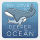 Une jolie baleine caricaturale embrasse son petit veau au milieu d'un océan bleu étincelant dans cette illustration de l'amour maternel. Le texte de bloc et de script entourant les animaux marins dit : "Mon amour est plus profond que l'océan." Cet autocollant fait un bel accessoire pour un baby shower à thème nautique.