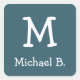 Autocollant carré arrondi avec nom blanc et monogramme sur bleu avec garniture carré arrondie blanche.