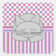 Une image d'un chat qui dort gris avec un sourire sur son visage contre un motif rose, violet et gris est un design unique pour les amateurs de félins.