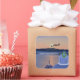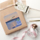 Cet autocollant de Noël présente le Père Noël survolant Santorin, en grec.