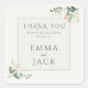 Cet autocollant de remerciement mariage romantique présente de délicates fleurs d’aquarelle rose vif, gracieusement complétées par des feuilles verts doux, encadrant élégamment les noms du couple heureux. Le design se situe dans un cadre botanique intemporel, mêlant raffinement vintage et élégance rustique. Parfait pour les souvenirs mariages d'automne ou la décoration de table de jardin, les couleurs douces pastel et les accents floraux verts créent un détail charmant et gracieux qui express des remerciements sincères et de la gratitude à vos invités. Cet autocollant ajoute une belle touche personnelle aux faveurs de mariage ou sacs cadeaux, améliorant l'ambiance romantique de votre journée spéciale avec subtile sophistication et beauté naturelle.