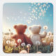 Deux nounours s'assoient dans un champ de pissenlit, regardant les graines flotter dans le ciel
