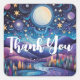 stickers Merci avec une belle illustration. L'ambiance fantaisiste et fantaisiste. Une grande lune brillante avec des étoiles tout autour. Perché sur un beau paysage d'arbres, de montagnes et d'une rivière sinueuse. Impressionnant mystique magique.