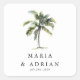 Des autocollants de mariage minimaux de palmiers tropicaux, avec une illustration de palmier à aquarelle en haut sur un arrière - plan blanc classique. Personnalisez les autocollants de mariage des palmiers avec le nom et la date.