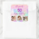 Pour une fête d'anniversaire de 50e (ou tout âge). Un collage de 3 de vos photos d'elle-même, d'amis, de famille, d'intérêts ou d'animaux de compagnie. Un arc-en-ciel féminin, arrière - plan de couleur holographique en violet, rose, or rose et vert menthe. Décoré avec des gouttes de parties scintillant, la peinture goutte à goutte. Personnalisez et ajoutez son nom et son âge de 50 ans. Le texte : joyeux anniversaire est écrit avec un script de style à la main tendance avec des swashes. Texte de couleur violette.