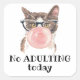 Aquarelle chatte soufflant bulles rose bubblegum avec lunettes de style rétro et drôle "Pas d'adulting aujourd'hui" texte.