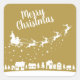 Cet autocollant carré de Noël doré présente la silhouette du Père Noël avec son traîneau et ses rennes, volant au-dessus des maisons dans une traînée d'étoiles.