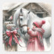 Des autocollants de Noël. Ai aquarelle illustration d'une scène sur une ferme rustique avec une petite fille sucrée entassée dans un manteau d'hiver rose prenant soin de son joli cheval blanc pendant un jour de Noël enneigé.