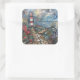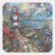 Sticker Carré du phare côtier. © Radenbrea Studios à Zazzle. Sticker avec une scène côtière représentant l'océan, un phare, un transat et un chemin fleuri à côté.