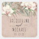 Sticker Carré Mariage pour enveloppes, sacs cadeaux ou autres accessoires de décoration de douche nuptiale. L'oeuvre a été peinte à l'origine à la main en aquarelle et est ensuite imprimée sur ces autocollants de haute qualité. Les orchidées blanches, magnifiques et élégantes, se mêlent aux feuilles de monstères kaki tan, au feuillage de palmiers brun et à la végétation de fougère à la sauge muettée. Copyright, Audrey Jeanne Roberts.