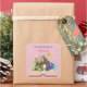 Un autocollant personnalisable en rose avec un thème de conte de fées montre un livre avec des châteaux, des bateaux de pirates, des poissons violets et d'autres symboles d'imaginaire.