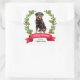 Sur ces autocollants de correspondance de vacances, un portrait d'aquarelle d'un chien Rottweiler est entouré d'une couronne d'airelles rouges. En bas se trouve une bannière rouge avec votre salutation de Noël personnalisée, et votre signature est en vert sous elle.