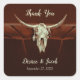 Peau de taureau de l'ouest du pays mariage rustique. Vintage cowboy inspiré merci autocollants carrés. Maison de ferme rustique brune personnalisée inspirée de vieux antiquité de l'ouest sauvage. Cool, tendance, design animal de ferme moderne. Copyright de l'image Marg Seregelyi Photography.