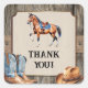 Saddle up et merci à vos invités d'être venus à une fête d'anniversaire à thème d'équitation. Un arrière - plan en planches de bois suggère l'intérieur d'une écurie avec un panneau tenu par des bracelets. Le panneau couleur crème est muni d'un cheval saddled pour remercier les invités d'être venus à une journée amusante avec des chevaux. Une paire de bottes de cowboy et un casquette sont placés vers le bas de l'autocollant avec des ornements de style occidental accusant le design. Disponible avec des produits correspondants.