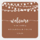 Ce collier rustique illumine en terre cuite mariage d'accueil autocollant carré est parfait pour un mariage classique. Le design comprend de belles lampes à cordes peintes à la main dans un arrière - plan en terre cuite. Ces étiquettes sont parfaits pour les sacs de bienvenue et les mariages de destination des clients de l'hôtel.