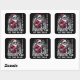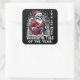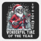 This sticker features a skeleton wearing a Santa Claus suit and hat, playing a red electric guitar. The design is set against a black background. Stylized pine trees and sparkling snow surround the figure. The text reads, "IT'S THE MOST WONDERFUL TIME OF THE YEAR". The design may look real due to the high detail and three-dimensional texture in the artwork.