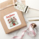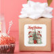 This charming sticker features three snowmen gathered around a decorated Christmas tree. They are all wearing Santa hats and red scarves, and are placing ornaments on the tree. A large red gift box with a bow sits at the base of the tree. The greeting "Merry Christmas" is written in red script above the scene. The design is set against a clean white background. The design may look real due to the high detail and three-dimensional texture in the artwork.