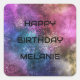 Un motif d'art de galaxie coloré cool avec le texte : Happy Birthday Melanie et un modèle de texte. Cliquez sur Personnaliser pour modifier le texte et le nom à votre place.