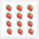 A ripe strawberry with visible seeds and green leaves, clean sticker illustration