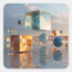 The materials feel rich and tactile—glass-like cubes shimmer with layered textures, while polished spheres glow with warm, planetary tones. Light plays across every surface, creating subtle highlights and reflections that reward closer inspection. The contrast between organic desert forms and precise geometric shapes gives the artwork a futuristic yet meditative atmosphere, blending natural calm with abstract design.