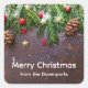 stickers de Noël avec une photo rustique d'une table en bois marron avec des pinecones, des aiguilles de pin, de la neige et des ornements de Noël. Festif et adorable.