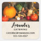 Des autocollants d'affaires avec la photo d'une récolte d'action de grâce, posés sur une table en bois rustique. Citrouille, pommes de terre, courge etc... composent cette belle collection de nourriture. Des feuilles d'automne colorées entourent le panier de la cornucopie.