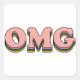 Texte en bulle multicouche OMG en rose pêche, rose corail, vert et jaune moutarde.