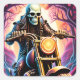 un squelette grippé dans un vélo de pandemonium. Il a un pantalon en cuir noir et des bottes de moto et une veste en cuir noir avec un design osseux sur la tenue de cale.Le soleil couchant derrière lui. La brume qui monte de l'entourage jusqu'à la nuit sombre, il s'éloigne avec des étoiles de nuit au-dessus.