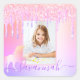 Un arrière - plan tendance aux couleurs pastel unicorne et arc-en-ciel rose, violet et or rose. Décoré avec des gouttes de parties scintillant en or rose, rose, violet et une licorne de couleur arc-en-ciel. Lettres violettes. Personnalisez et ajoutez votre nom écrit avec un script de style à la main simple avec des swashes. Pour que les swashes ne suppriment que le nom de l'échantillon, laissez les espaces ou émoticônes devant et après le nom. Ajoutez votre propre photo.