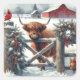 Ai aquarelle illustration d'une scène sur une ferme rustique avec une vache Highland, cardinal et poulet assis derrière une clôture de bois décorée dans des cônes de pins, des baies et de la guirlande le jour de Noël.
