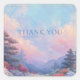 Step into a world of vibrant, painterly beauty with this stunning landscape sticker. The design features a breathtaking mountain valley, rendered in a rich, fantastical color palette reminiscent of a dream. Lush trees and bushes burst with vibrant pink, magenta, crimson, and soft blue blossoms, creating a magical frame around the scene. These colorful slopes lead down into a hazy valley, with distant mountains rising against a beautiful, painterly sky swirled with soft blue, pink, and white clouds. A minimalist, thin gold square frame provides a clean, elegant border for your message, adding a final touch of sophistication to this ethereal vista. These stickers are perfect for businesses that evoke creativity, beauty, and imagination, such as artists or photographers, boutique event planners specializing in vibrant themes, travel agencies promoting scenic destinations, or unique gift shops. This versatile design can also be used to beautifully seal envelopes for colorful weddings or special events, or as a sophisticated accent on party favors and gift wrapping.