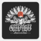 Trois crânes de chef souriants en toques culinaires, plusieurs couteaux de cuisine dans le dos s'évanouissent dans un motif en demi-cercle. La légende "Chef Life - découpé et découpé" ci-dessous