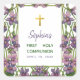 Le texte se trouve à l'intérieur d'un cadre floral de violets violets (aux bordures rectangulaires vertes).Il y a un (faux) croix dorée au-dessus du texte. Le nom est écrit dans un script d'écriture manuscrite, le reste en casquette. Les mots Première Sainte Communion sont verts, l'autre texte est violet, comme les violettes. Les violettes proviennent d'une carte de voeux de Pâques de 1913, publiée par Raphael Tuck & fils, maintenant dans le domaine public.