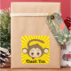 Illustration d'un visage de singe avec des joues rougissantes et sa langue qui sort. J'ai l'air mignon et kawaii. L'arrière - plan est un joyeux motif jaune et orange avec des rayons de soleil éclatant autour du singe, le faisant paraître super puissant. Merci écrit dans une police noire cool.