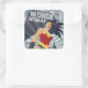 Wonder Woman debout haut avec ses poings à ses côtés. Dans l'arrière - plan, vous pouvez voir les grands immeubles de la ville et les gratte-ciel, contre un coup de soleil rétro et le nom de Wonder Woman dans le ciel.