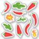 Un jeu amusant d'autocollant de dessin animé comprenant des piments rouges, des plantes de cactus et des flammes chaudes.